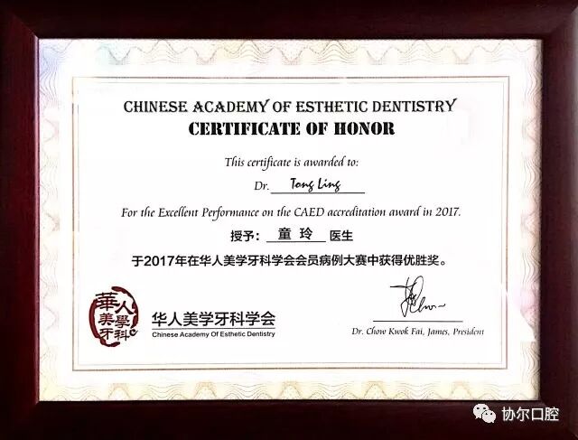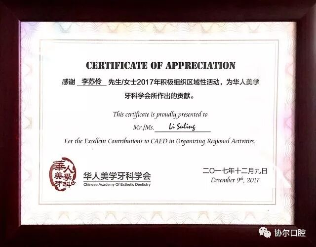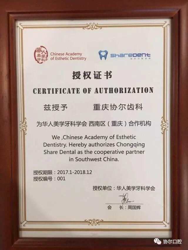 特别要说明的是在今年年初华人美学牙科学会授予协尔口腔西南区唯一的合作机构。
