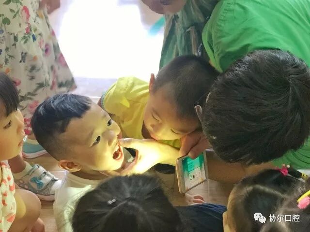 喻刚医生为刷完牙的小朋友检查牙齿